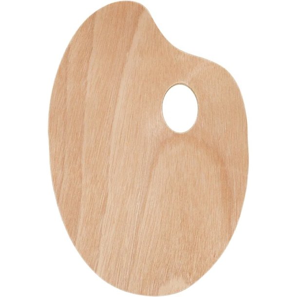 Malerpalette i træ som måler 20 x 30 cm. Der er hul, som gør det nemmere at holde og balancere, når du bruger den.